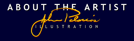 John Palacios received his Bachelor of Arts degree with distinction in 1986 from San Jose State University in San Jose, California. He worked for several years in the San Francisco Bay Area before relocating to the Pacific Northwest near Portland, Oregon in 1992, where he currently resides. Palacios has worked in several fields within the Graphic Arts industry over the years. He has been both a production artist (in the B.C. era -- before computers, that is) and a graphic designer. When computers became the overwhelming tool of choice in the industry, he transferred all his skill and experience to the Macintosh computer system. His studio remains exclusively "Mac-powered" since 1991. Most of his work career has been as a freelance artist for other design studios and for several small to midsize companies. In the last several years he has specialized in traditional illustration. He works primarily in acrylic and watercolor, but is comfortable with most media. Many of these projects have been for children's entertainment and educational products. Some clients include the Oregon Children's Theatre in Portland, Oregon; the San Jose Children's Theatre in California; Primary Concepts Educational Products in Berkely, California and most recently, Rigby's "On our Way to English" program, a part of Harcourt's Supplemental Publishers group in Illinois.